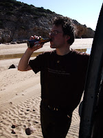 Will fixed the proper jack, by bashing it with two large rocks - there was some precision application of screwdrivers etc as well but it was mostly rocks and bashing - we scavenged a solid crate-side among the driftwood to use as a jack stand and even better 4 large pieces of 5mm MDF from a nearby abandoned ruin of a building and we figured that; we had 2 days worth of proper food (we had cooked some bbq but not all of it and hadn't really appreciated it the previous evening), 4 days if you count the emergency pasta, enough beer in the fridge for 3 days, we weren't that far by bike from civilisation and anyway, we knew a German in Sagres who owed us a favour.... and it was all looking up! - or so we reasoned to the scottish dog walking man who came over to see if we were ok but couldn't really offer anything more useful than moral support. He asked how we got there, we said "we were looking for adventure", he laughed :)